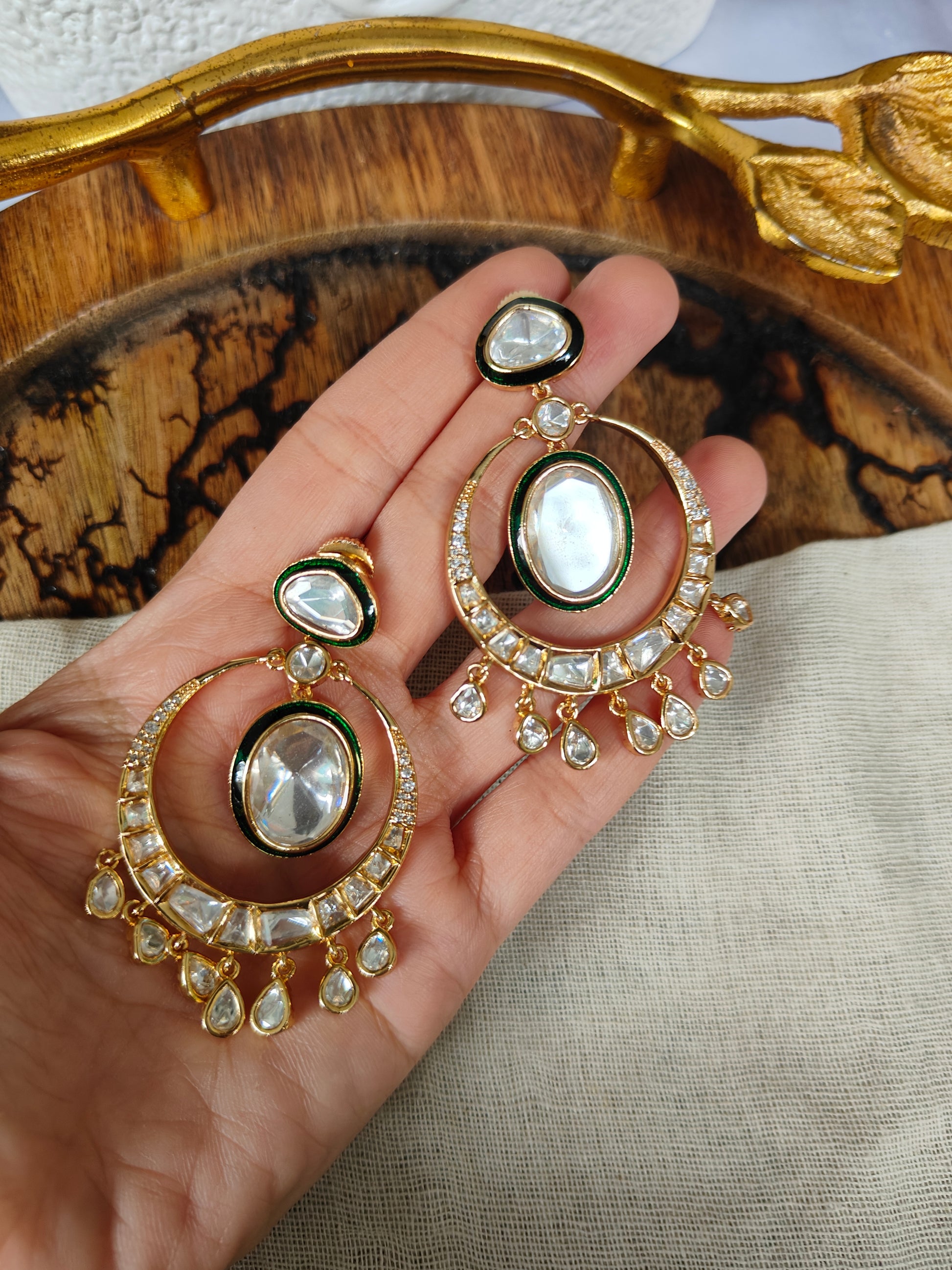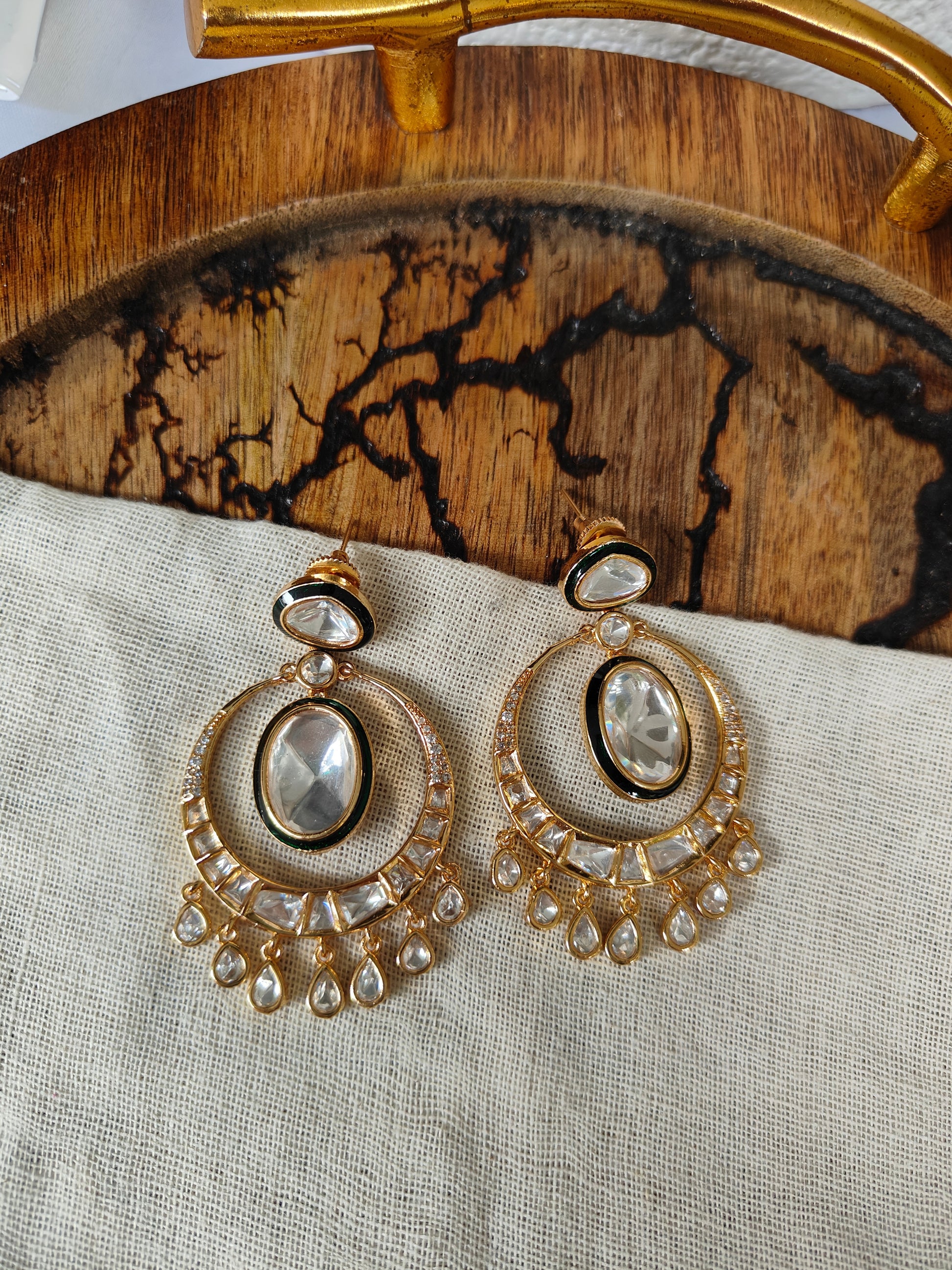 A little glam never hurt anybody — these chand-style danglers are proof. Hand-crafted with Moissanite Polki and finished in a rich gold tone, the pair brings together tradition and a soft modern sparkle. The centre oval stone steals the show, while the cascading pear-shaped drops add that effortless festive sway we all love.