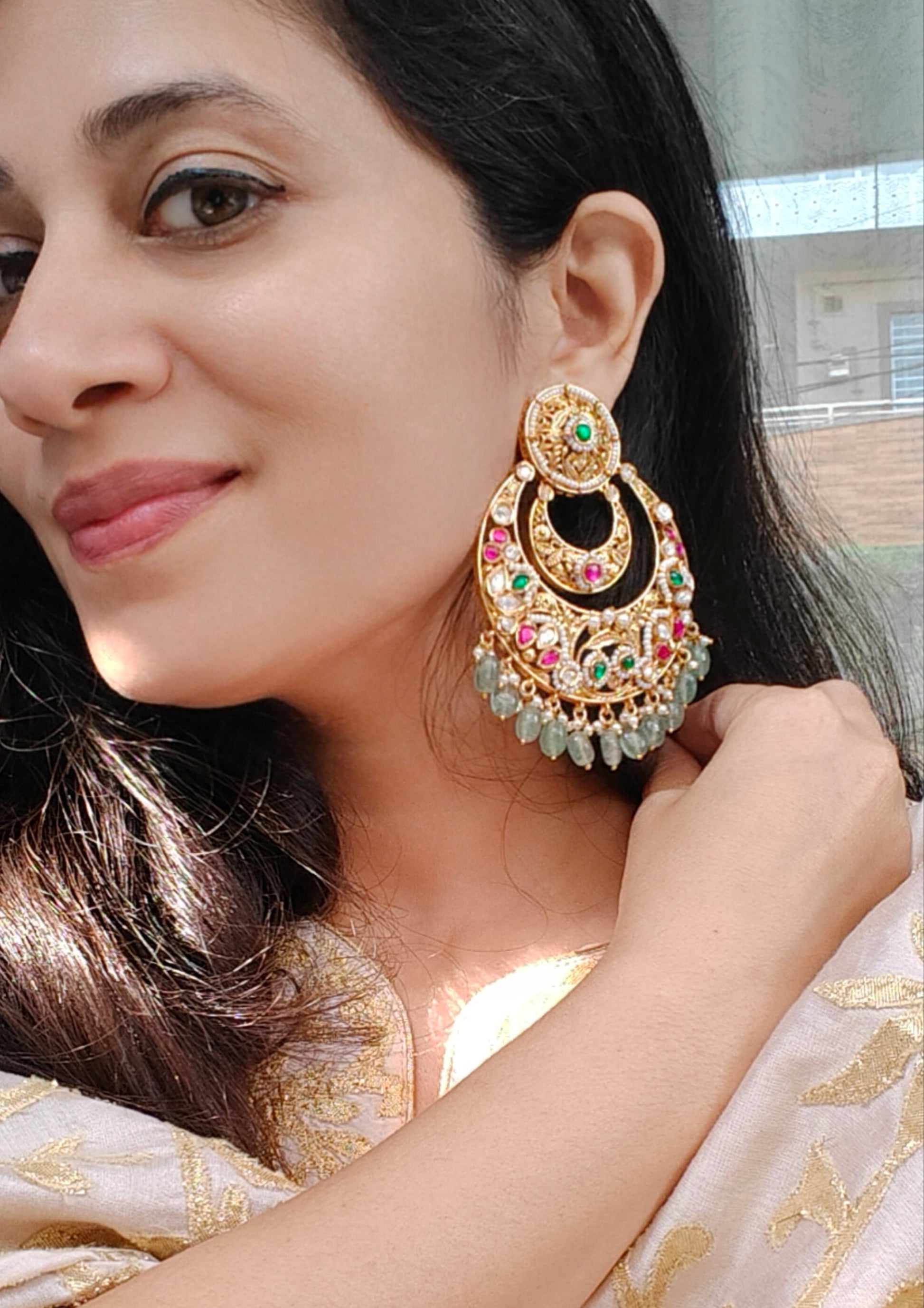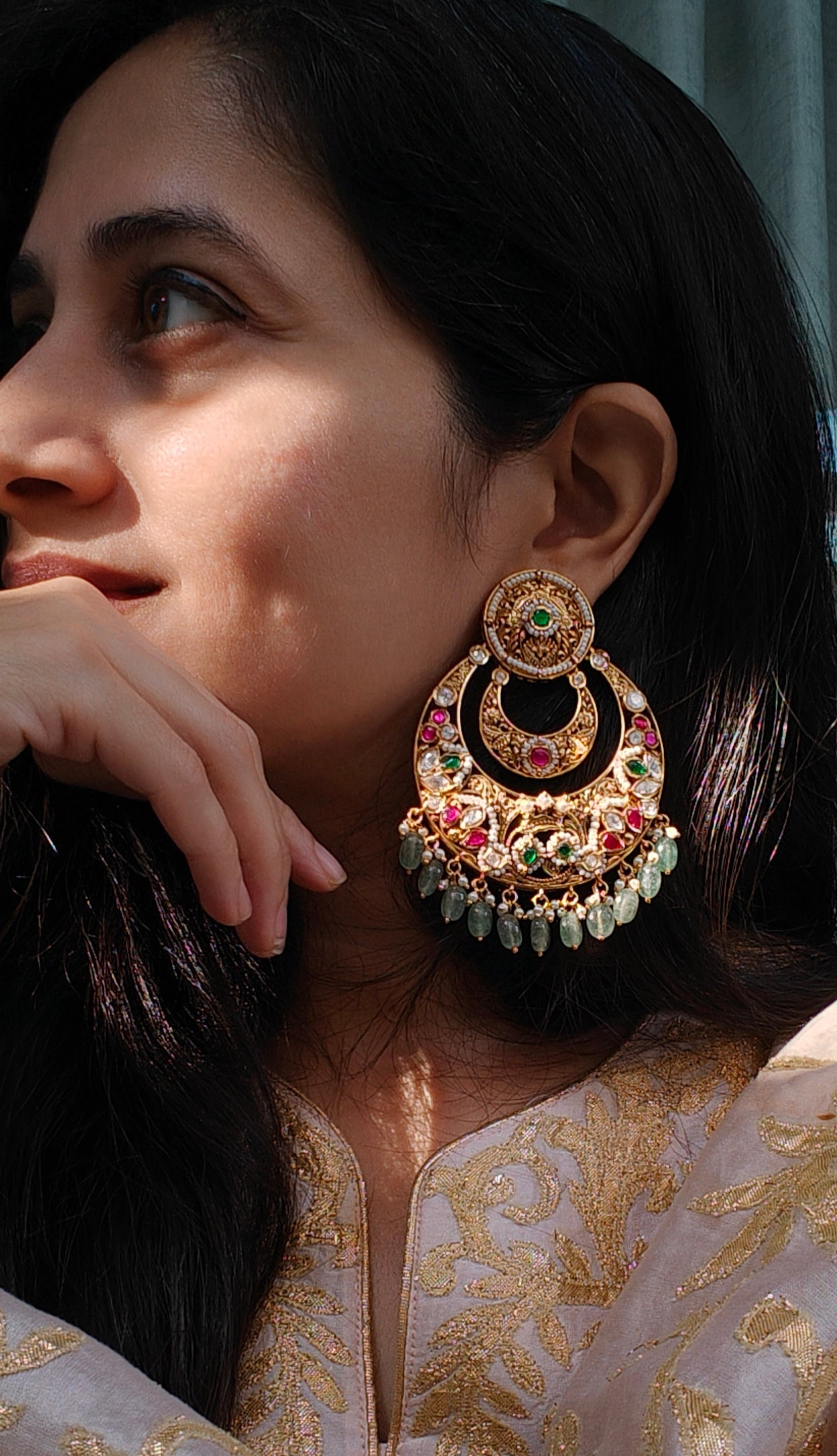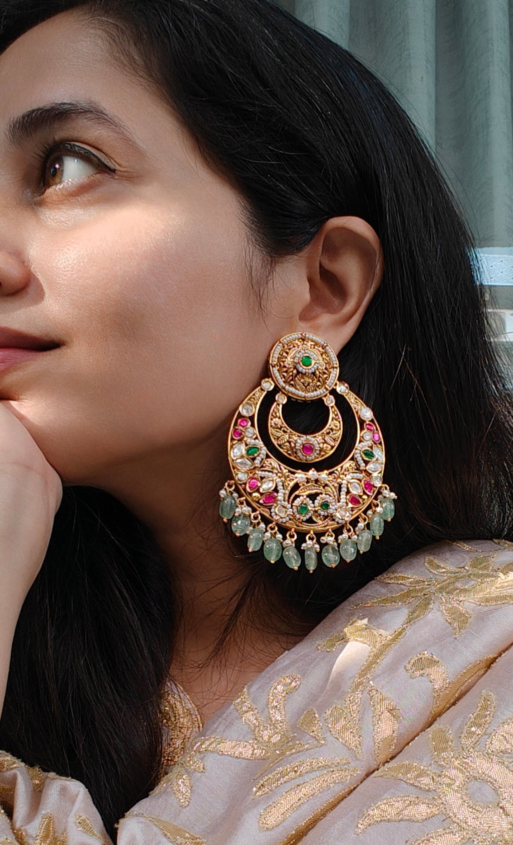 A masterpiece from our Luxe Collection, these chandbalis are crafted in the timeless art of Jadau and finished in 18kt gold polish. Hand-set with vibrant kundan, ruby, and emerald accents, and adorned with delicate green drops, they embody the grandeur of India’s regal traditions. A rare jewel for those who value exclusivity and heritage.