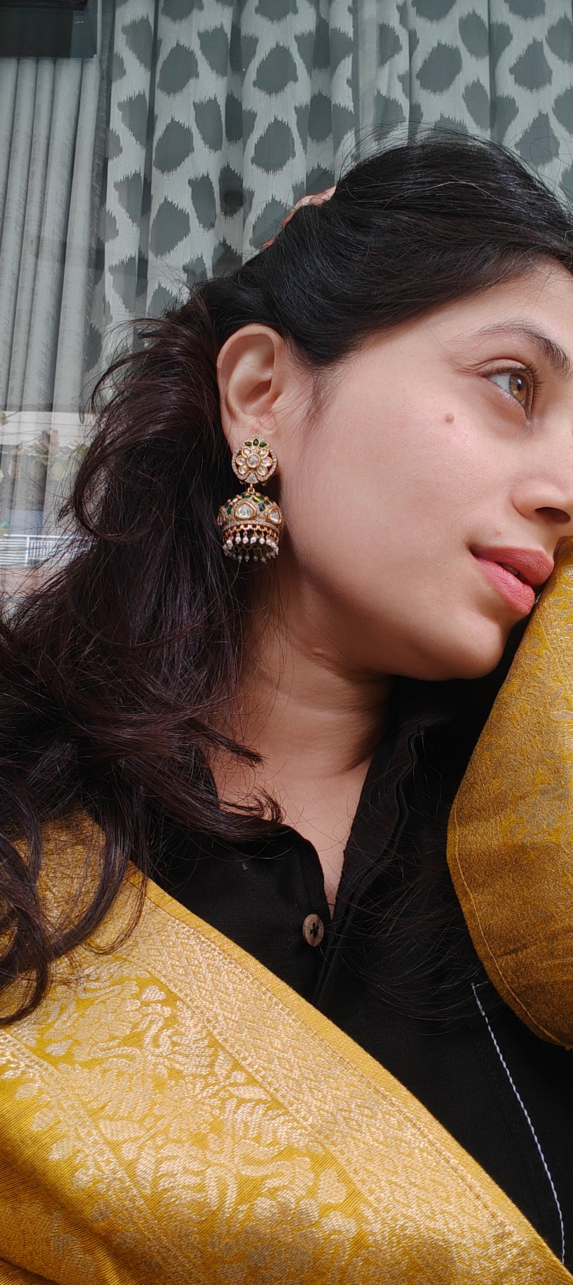 Designed in a warm gold-tone finish, these jhumkas are perfect for weddings, festive celebrations, mehendi functions, and traditional occasions. Despite their statement look, they are thoughtfully crafted to remain comfortable for extended wear. Pair them with silk sarees, lehengas, or anarkalis to create a regal, timeless ensemble.