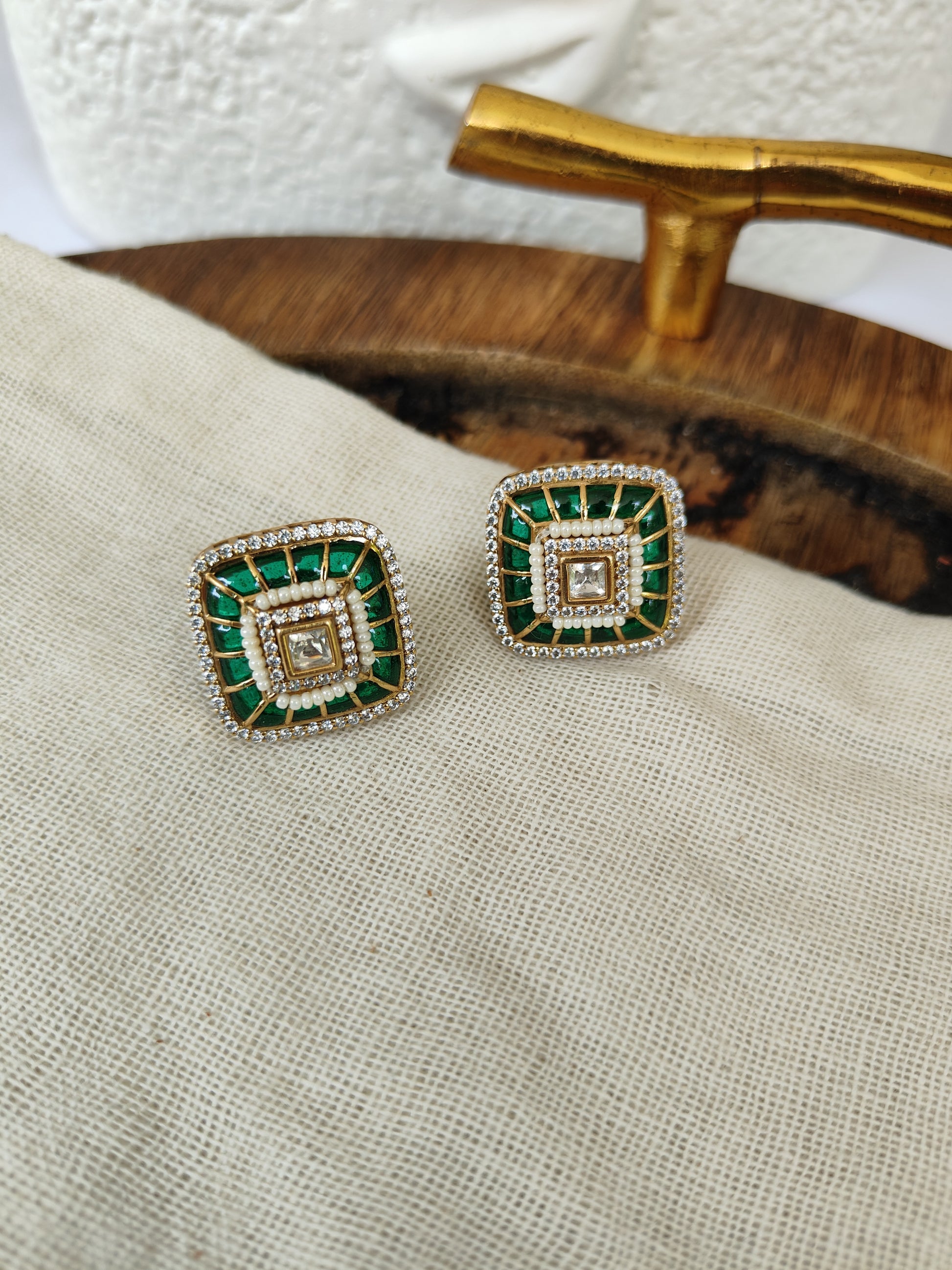 Channel your inner courtesan royalty with our Emerald Glow Studs, inspired by the timeless elegance of classic Bollywood opulence. These square-shaped luxury studs feature a harmonious blend of radiant green enamel work, shimmering kundan centerpiece, and a surrounding of micro pearls and high-polish CZ stones.