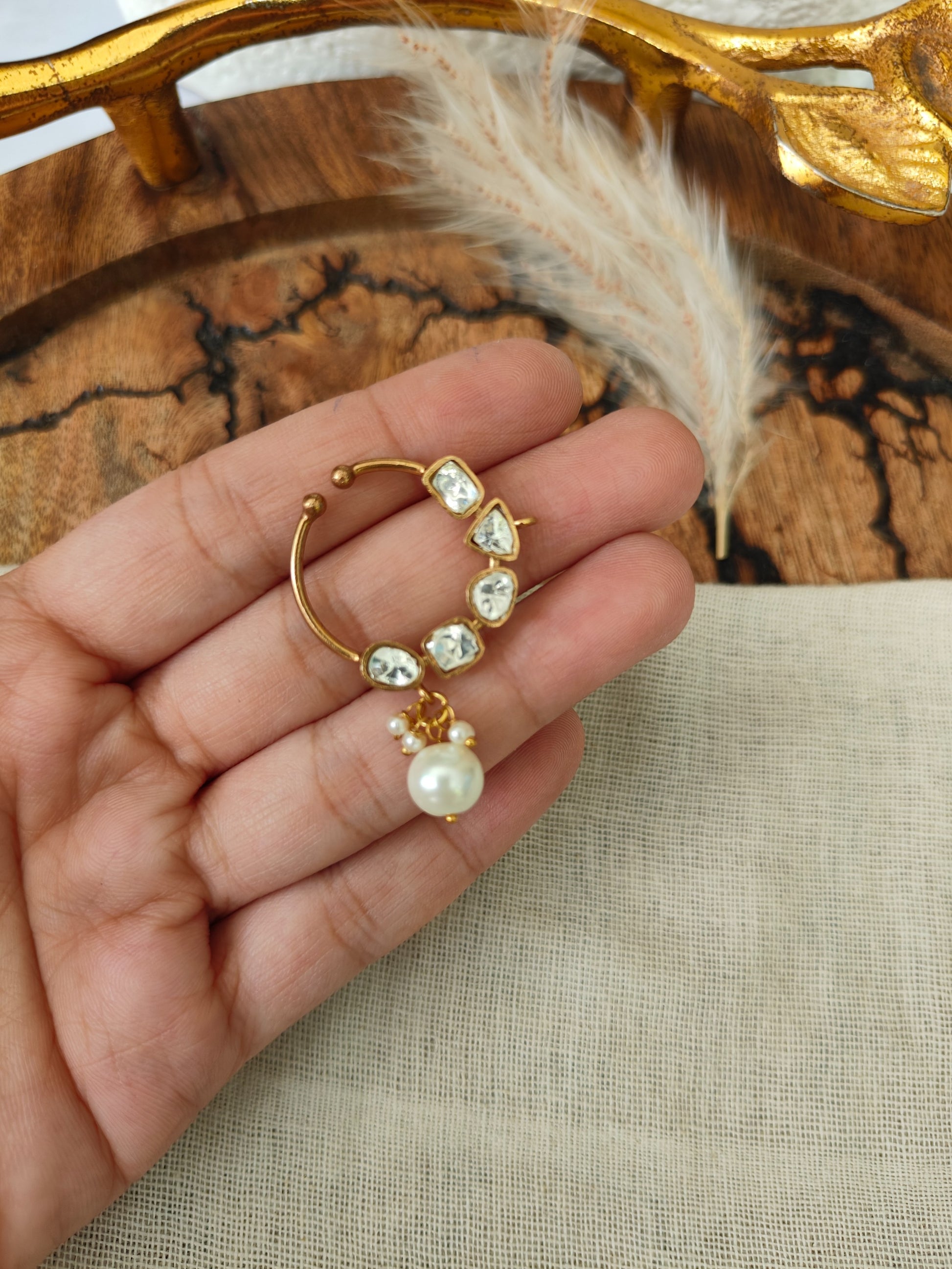 Delicate and effortlessly graceful, this nath features a sleek gold-toned hoop adorned with hand-set kundan stones that add a soft, luminous sparkle. The design is beautifully elevated with a dainty pearl drop charm, creating a perfect balance of minimalism and tradition. Lightweight and easy to wear, it offers a refined statement without overpowering your look.