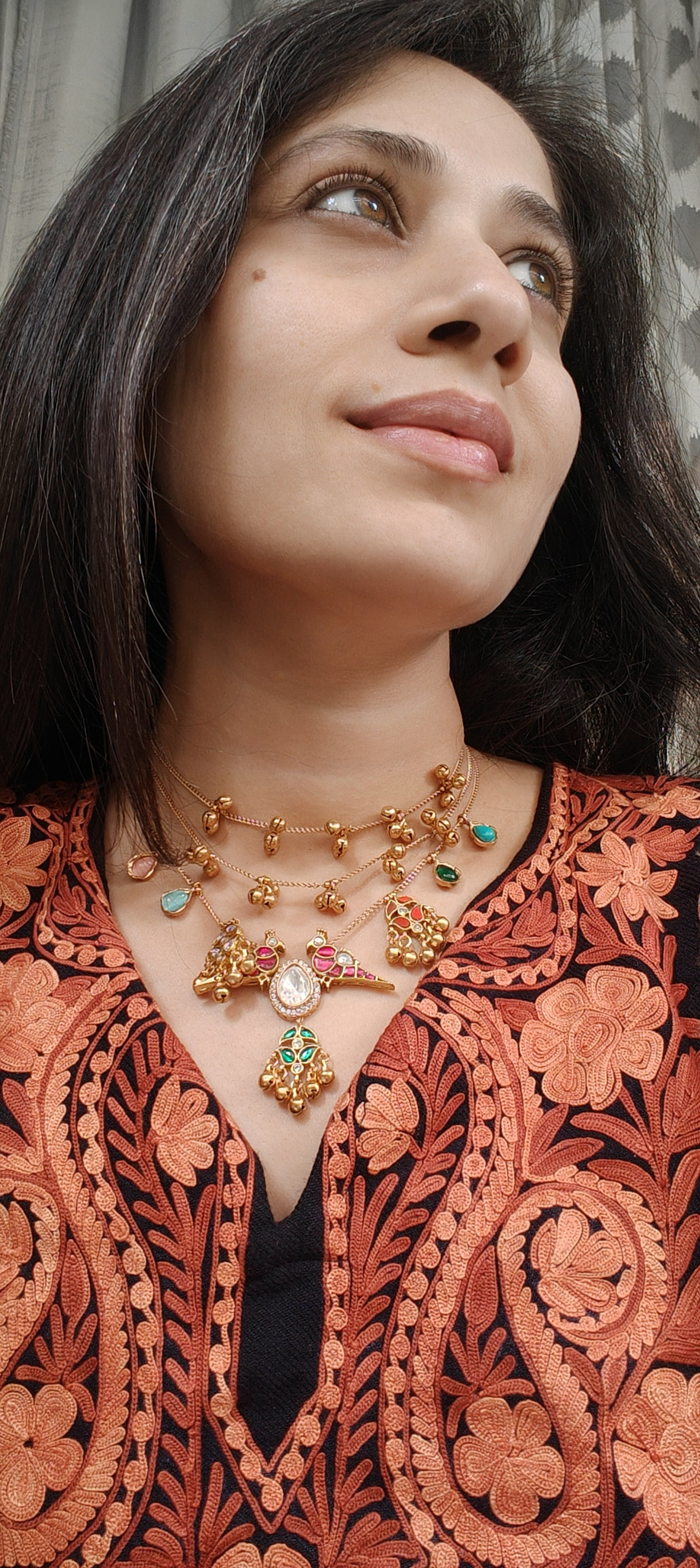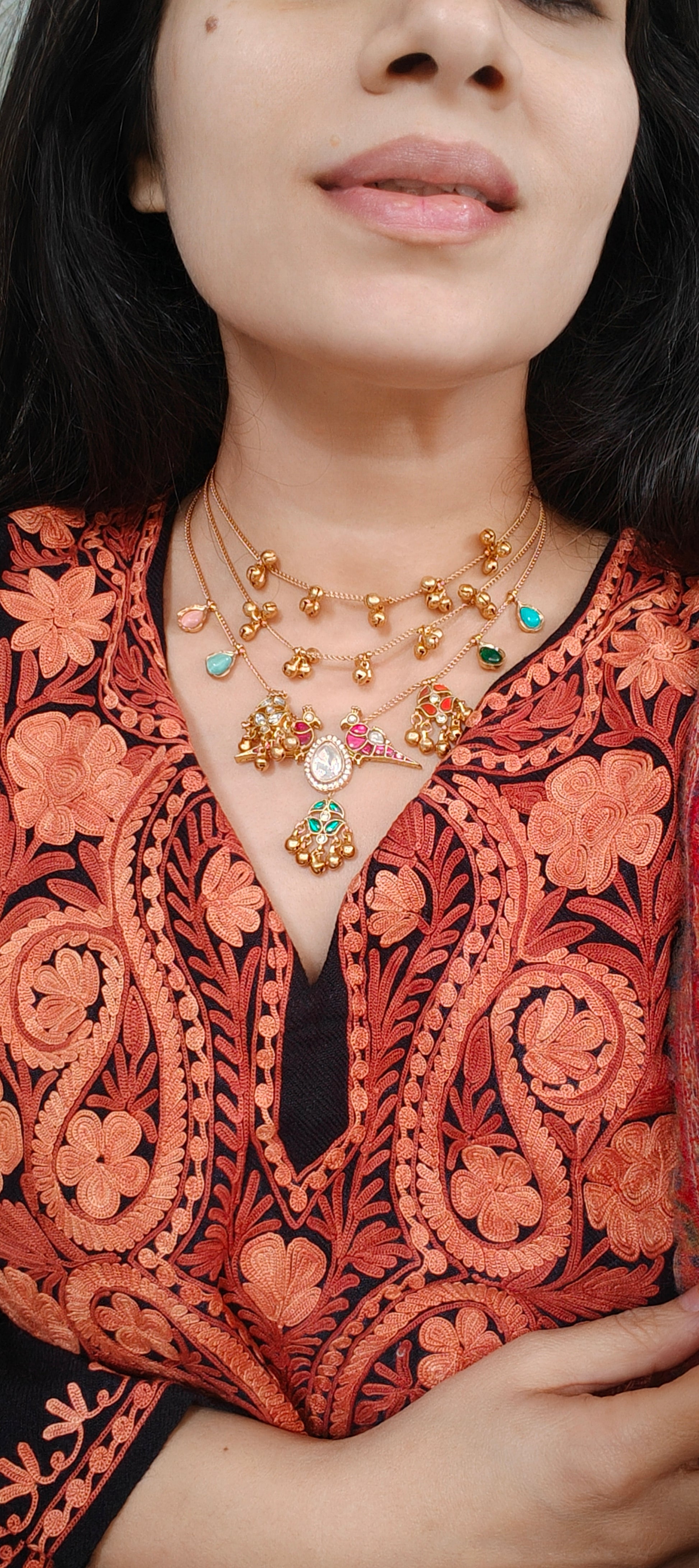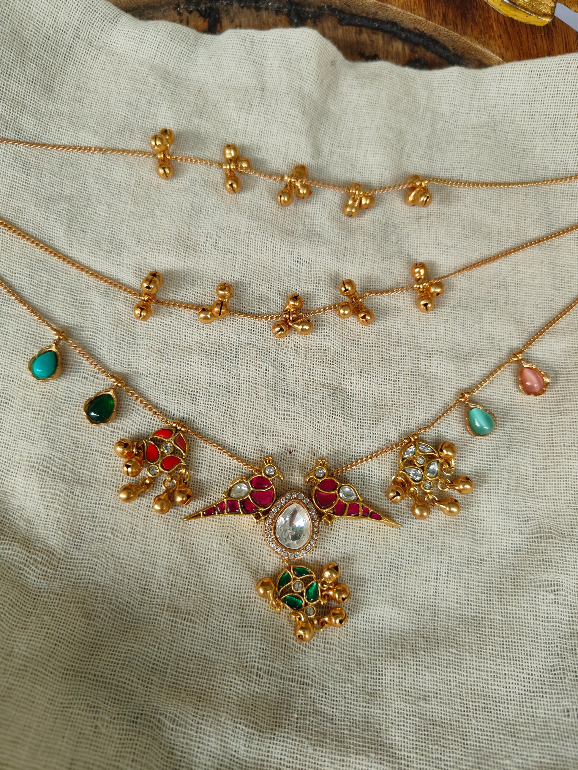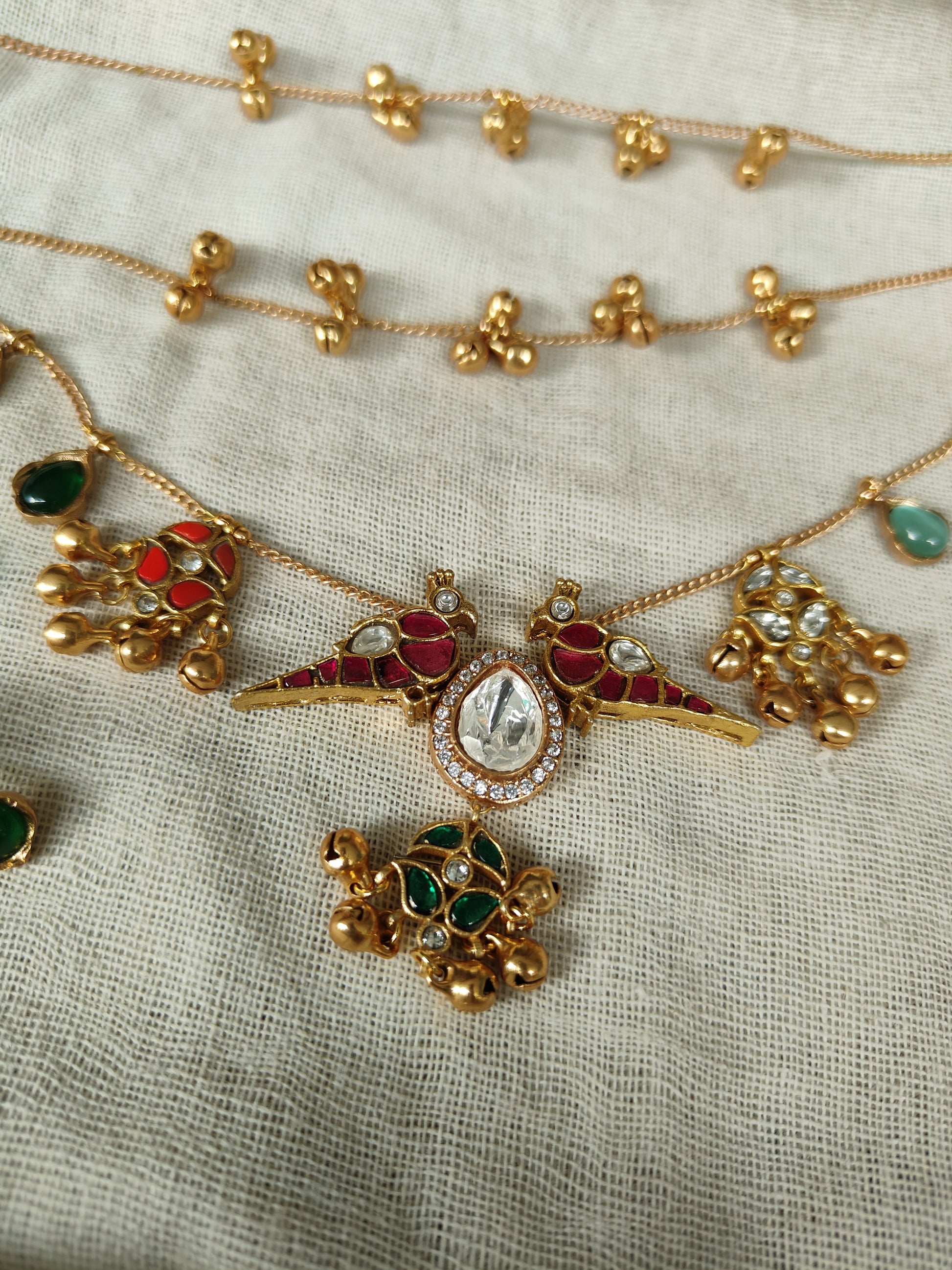 Elevate your traditional look with this stunning handcrafted jewellery set featuring intricate gold-tone detailing and vibrant enamel work in hues of red and green. The centerpiece showcases a beautifully cut mirror stone framed by delicate kundan-style accents, paired with matching jhumki-inspired motifs. The chain is adorned with charming miniature ghungroo clusters, adding a graceful movement and classic Indian appeal.