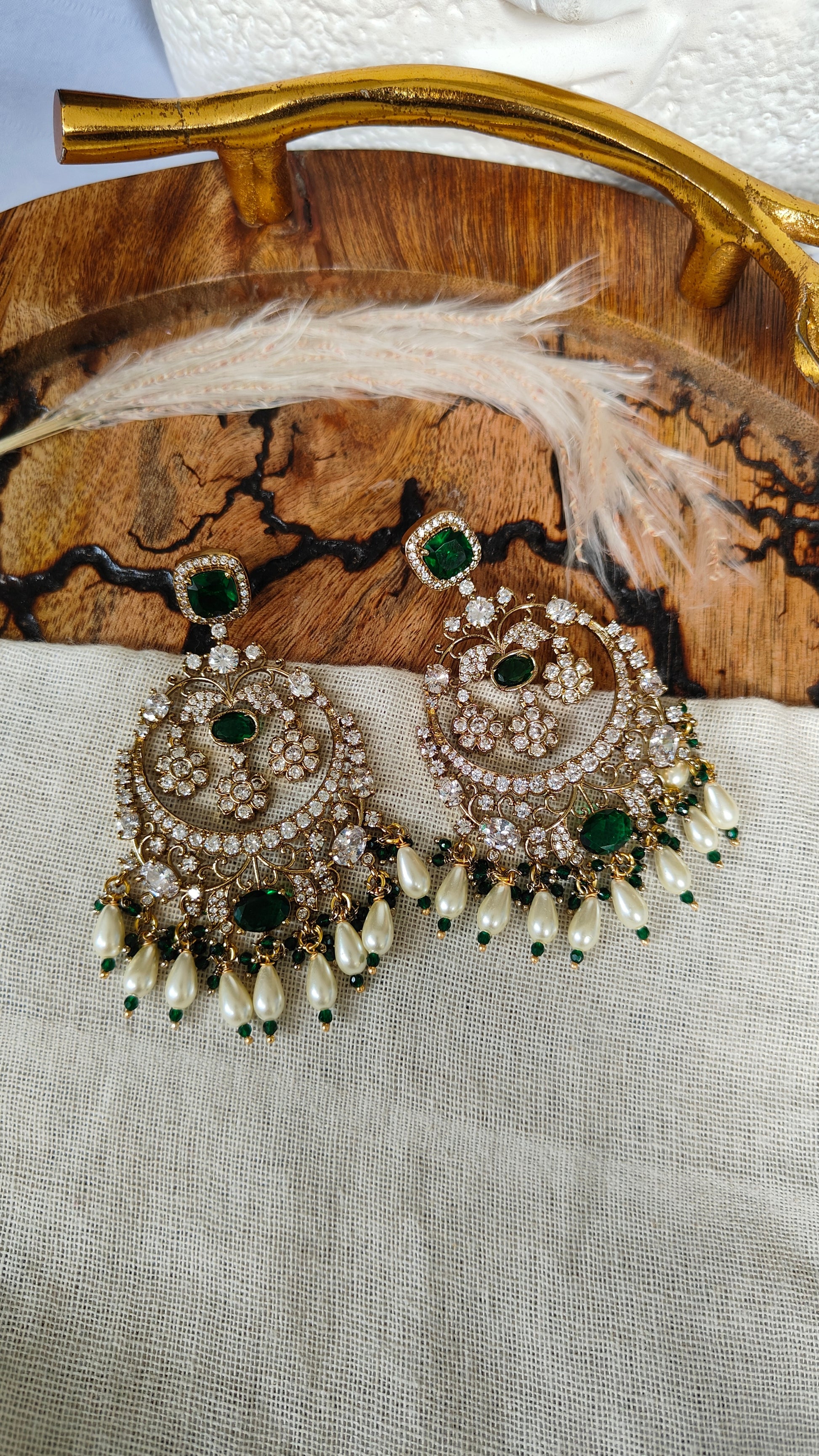 An ode to old-world romance, these handcrafted chaandbalis feature deep emerald-green stones framed with shimmering kundan work and delicate floral detailing. The crescent silhouette is finished with lustrous pearl drops and tiny green bead accents, adding graceful movement and timeless charm. Designed to feel regal yet wearable, they strike the perfect balance between tradition and elegance.