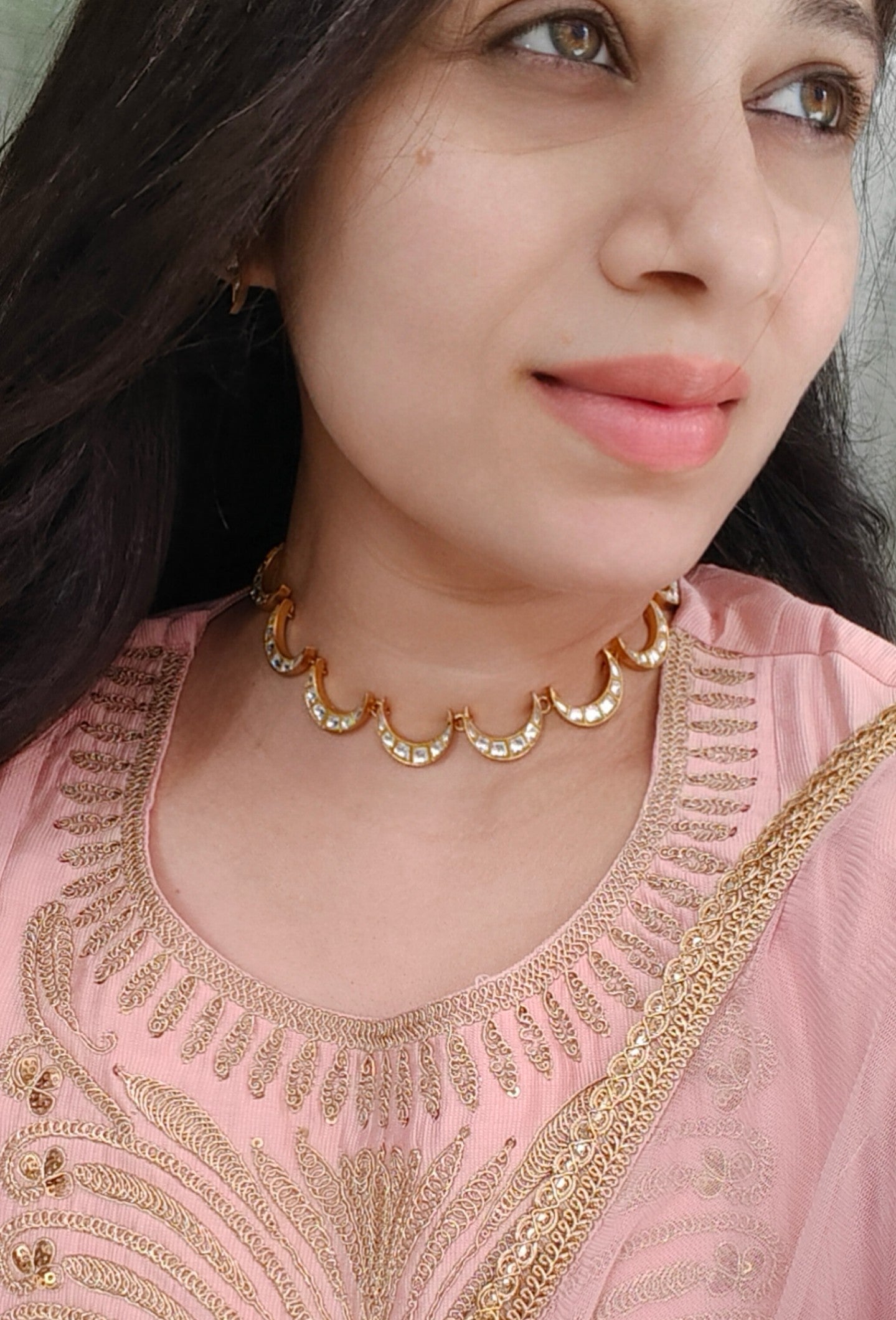 Inspired by the timeless beauty of the crescent moon, this exquisite necklace set features a series of delicately curved motifs adorned with hand-set kundan stones in a rich gold-tone finish. The rhythmic crescent design creates a graceful flow along the neckline, offering a perfect blend of traditional artistry and modern minimalism.