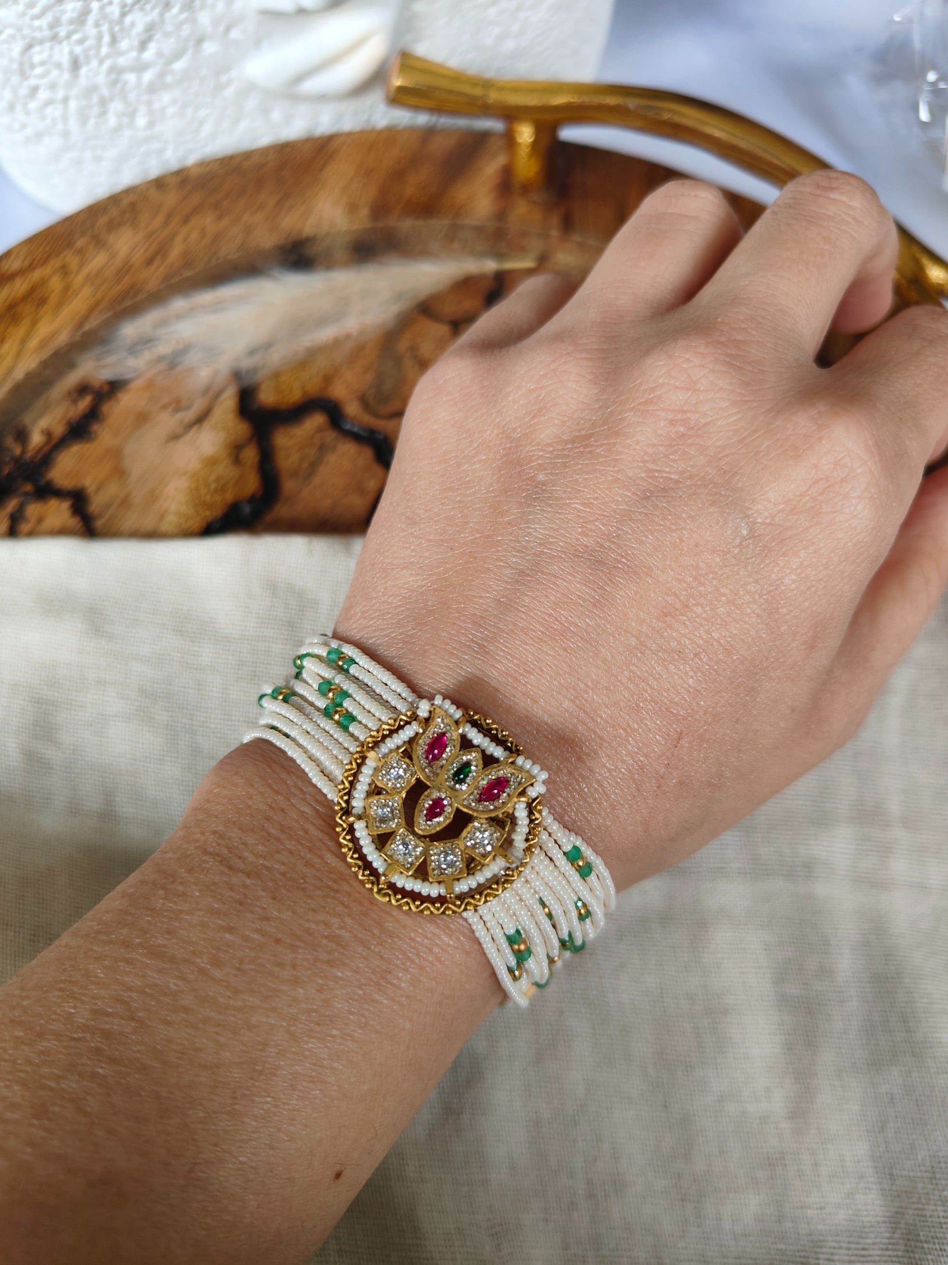 An elegant multi-strand pearl bracelet adorned with delicate green and gold bead accents, centered with a stunning Navratna-inspired kundan motif. The ornate gold-toned centerpiece features vibrant ruby-pink, emerald-green, and clear stones arranged in a floral pattern, adding a royal touch to the classic pearls. Designed to sit gracefully on the wrist, this bracelet blends traditional craftsmanship with timeless sophistication—perfect for weddings, festive occasions, and ethnic ensembles.