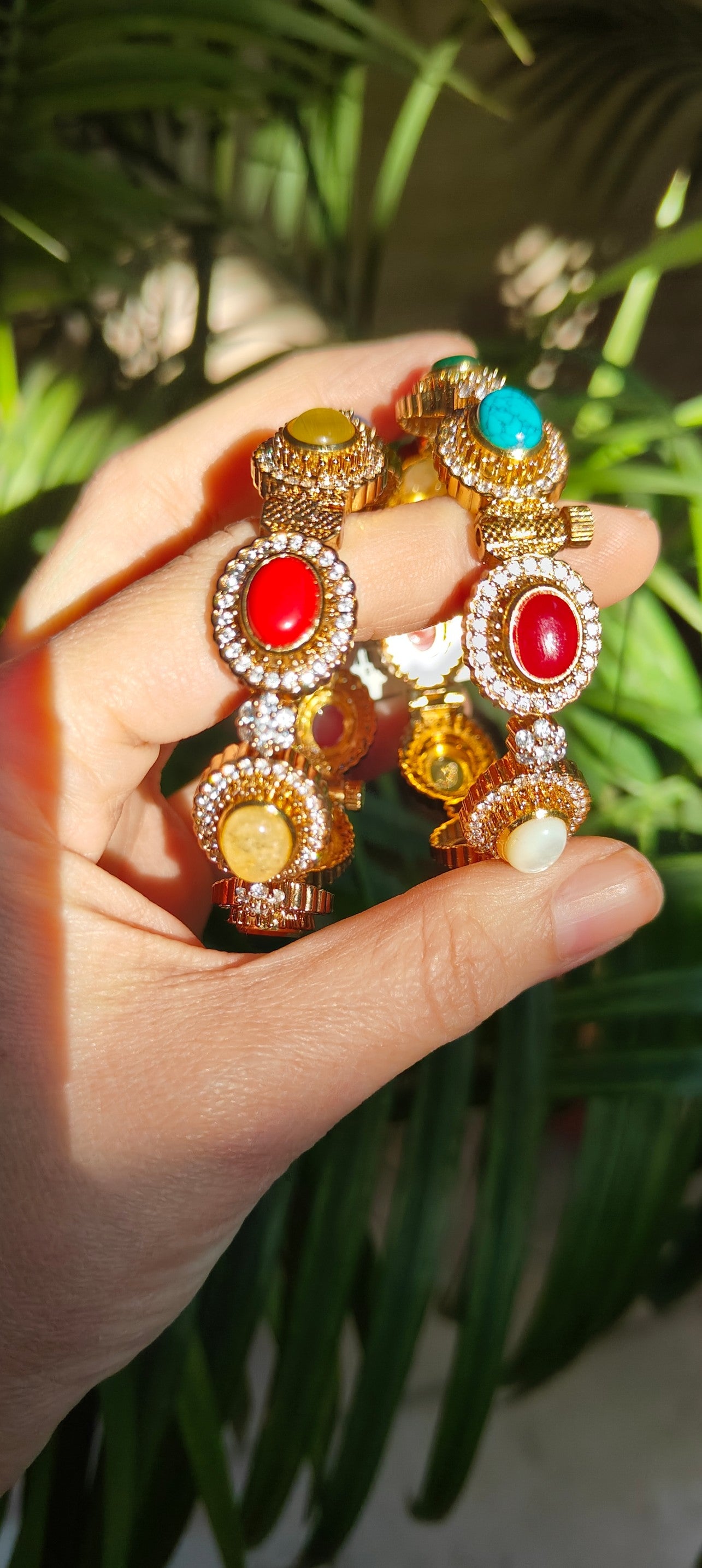 Introducing the Navratna Royale Statement Bangles — a vibrant blend of color, sparkle, and traditional elegance. Designed with bold oval center stones in rich hues like ruby red, turquoise blue, ivory white, and mustard yellow, these bangles instantly add a royal touch to any look.