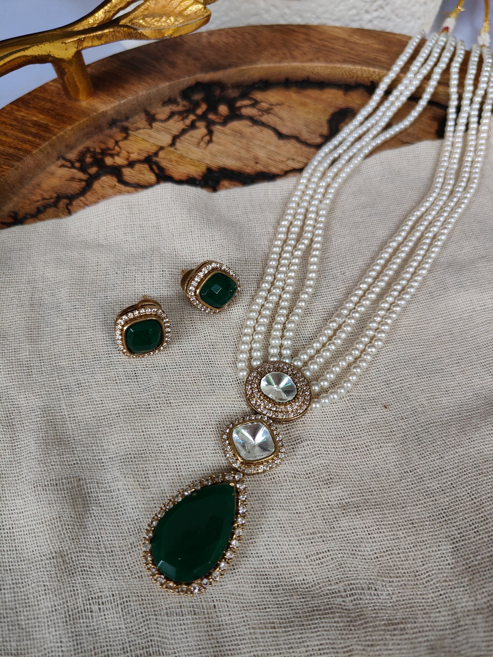 Elevate your look with the timeless charm of our Padma Necklace Set, a piece that whispers elegance and radiates confidence. Featuring four delicate layers of luminous pearls, this necklace flows gracefully, drawing attention to its striking green teardrop pendant, surrounded by a halo of shimmering crystals.