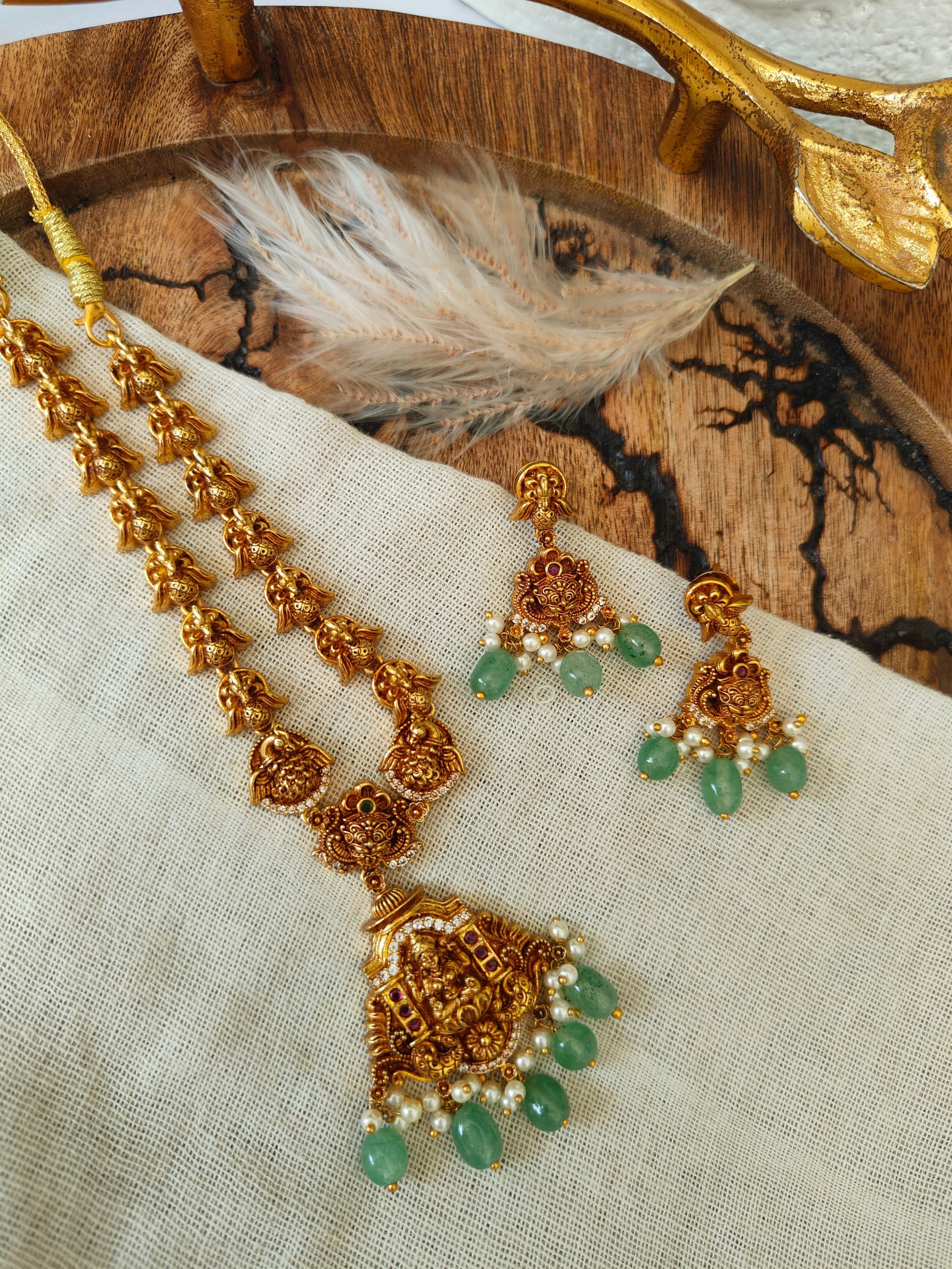 Accentuated with soft pearl clusters and soothing green stone drops, the design brings a perfect balance of richness and grace. The matching statement earrings mirror the intricate detailing, completing the look with effortless harmony.