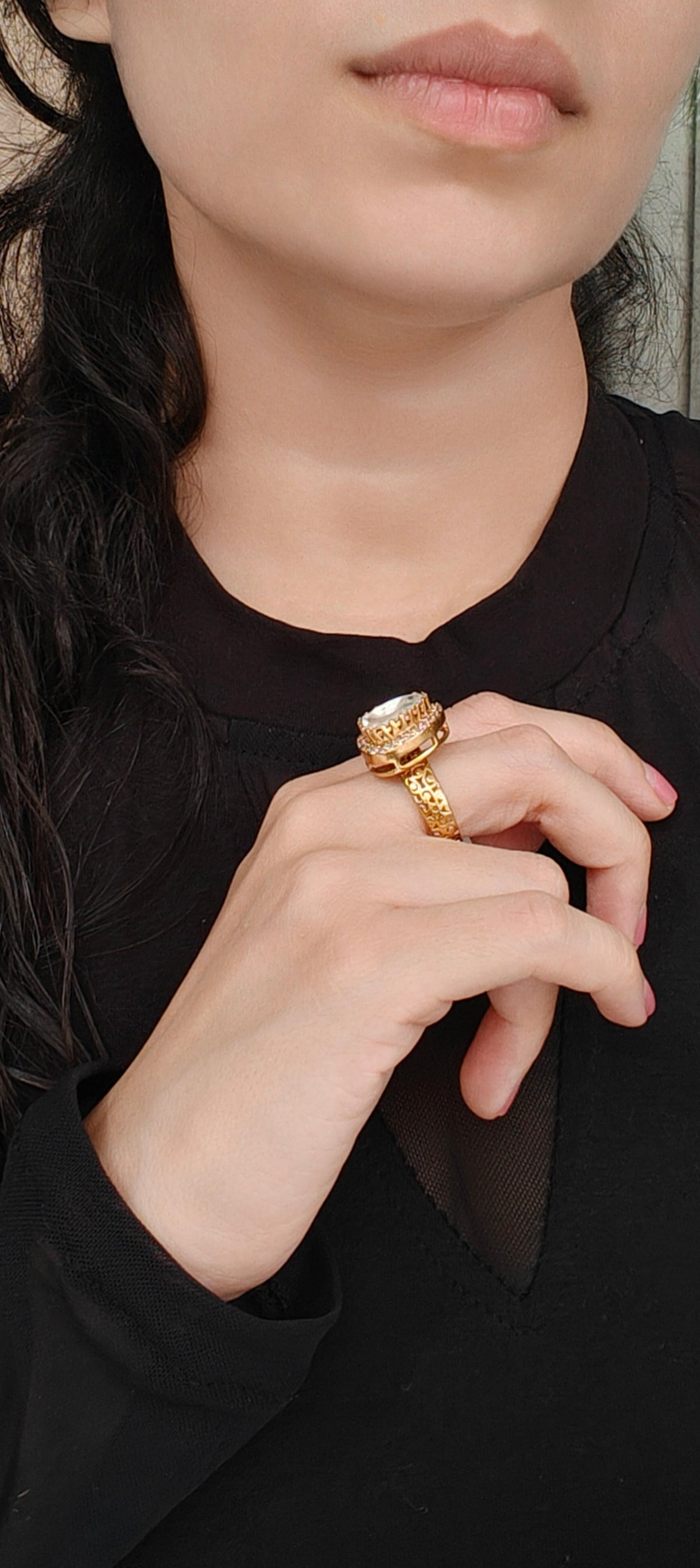 A statement piece with timeless charm, the Polki Ring showcases a stunning teardrop-cut Polki-style stone framed by a halo of delicate crystals. Set on a gold-toned adjustable band, this ring exudes elegance and sophistication, making it the perfect accessory for festive occasions or to add a regal touch to everyday wear.