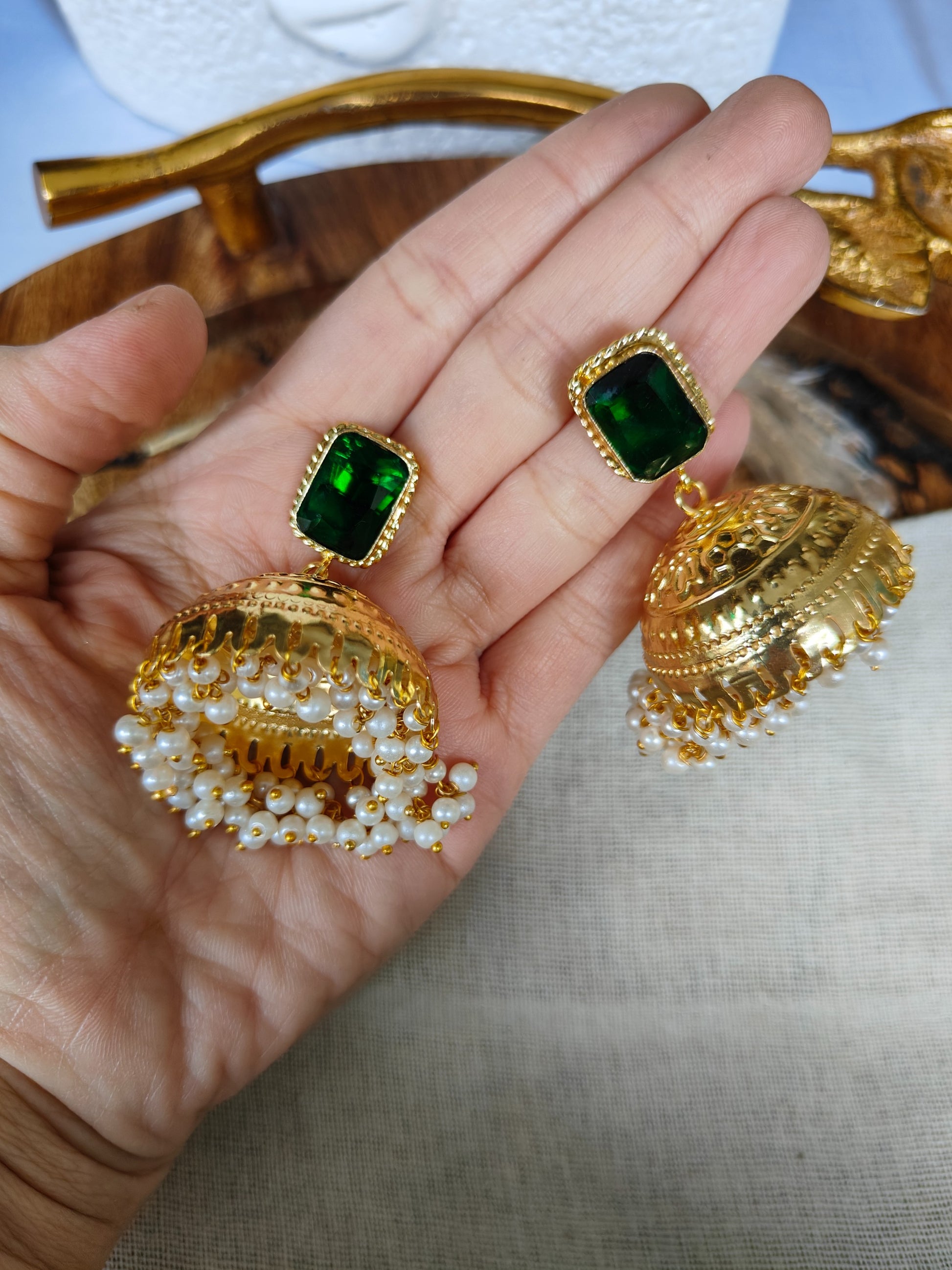 Introducing our handcrafted Dhara Jhumkas, a stunning blend of tradition and contemporary elegance. Designed with intricate embossed gold detailing, each dome-shaped jhumka features a statement-cut stone at the top and is beautifully finished with delicate pearl clusters that sway gracefully with every movement.