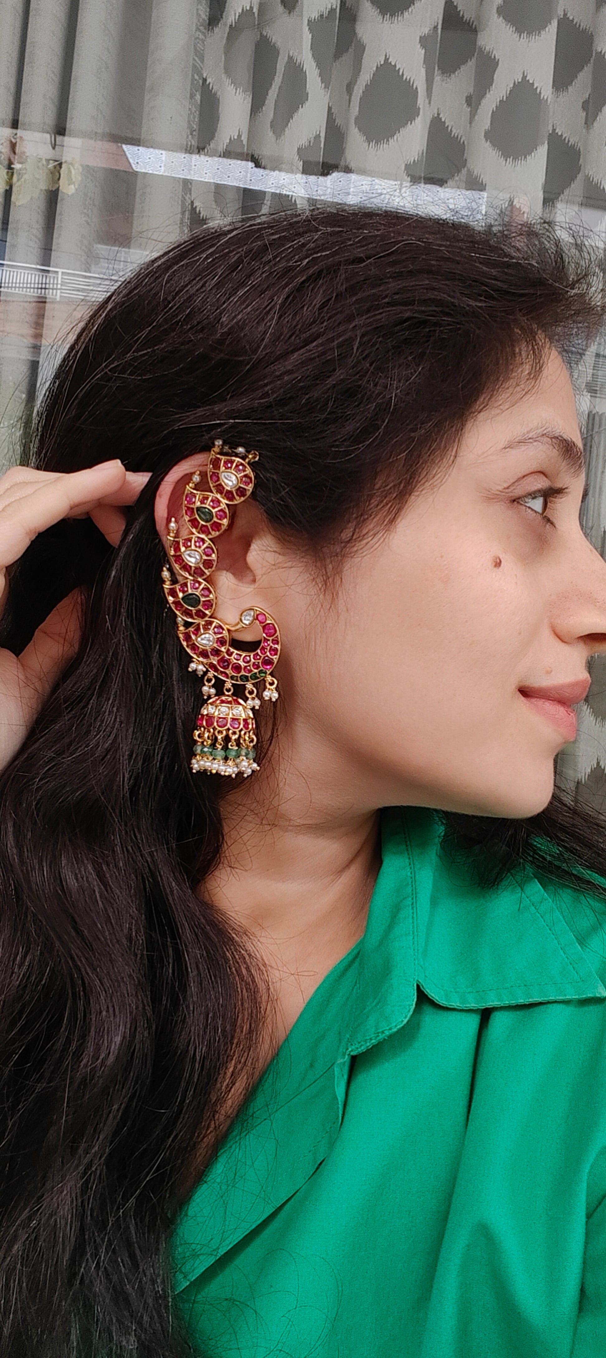 A traditional jhumka drop hangs from the base, finished with clusters of green beads and small pearl drops that add movement and a decorative finish. The structured crescent form combined with the detailed stone setting gives these earrings a classic, traditional appeal, making them well suited for weddings, festive celebrations, and ethnic ensembles.