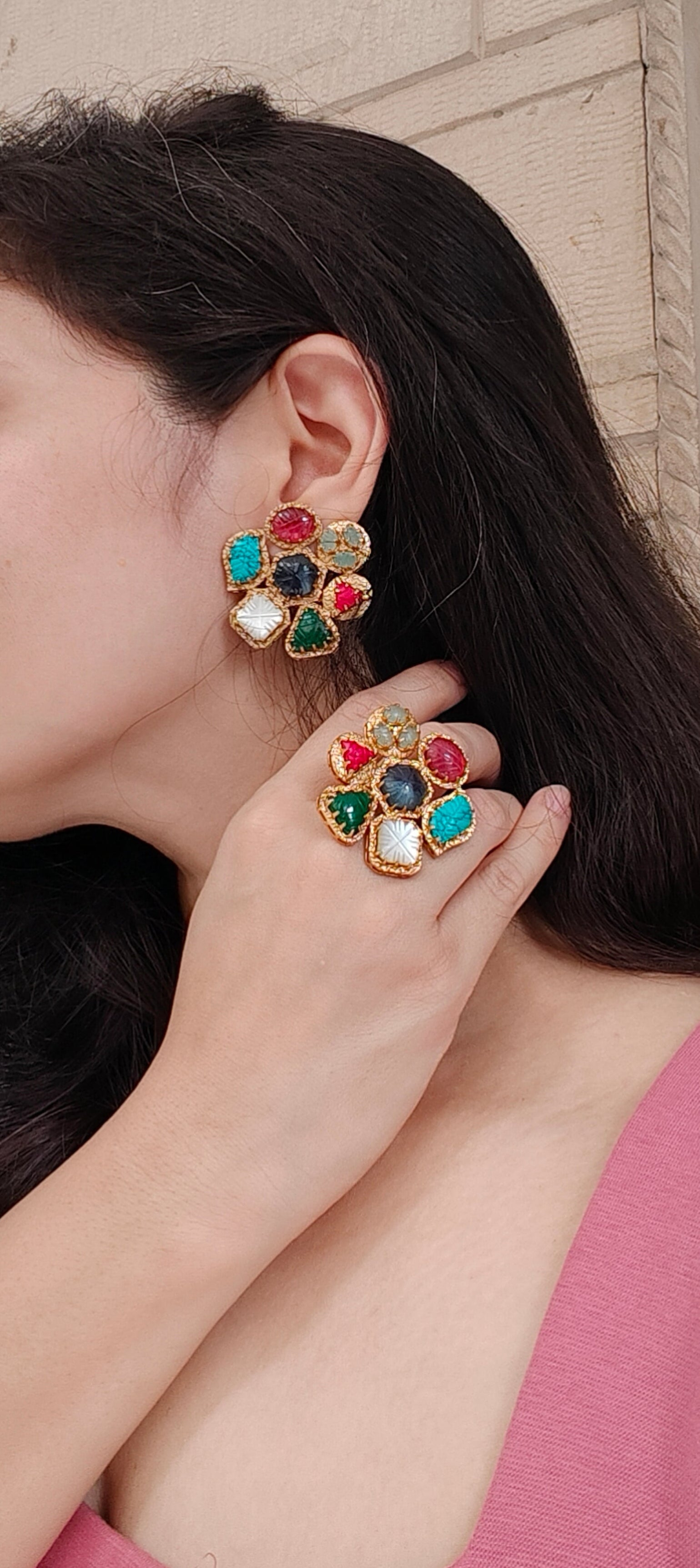 Make a statement of timeless elegance with the Saba Navratan Ring. Beautifully crafted in 18kt gold plating, this adjustable ring showcases the splendor of nine vibrant semi-precious stones arranged in an exquisite floral design. Each stone carries symbolic significance of prosperity and positivity, making this piece not just jewelry but a touch of heritage and grace.