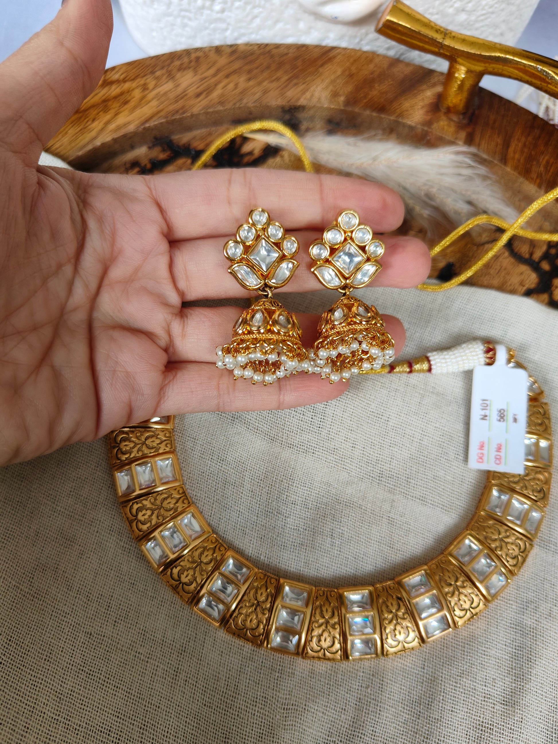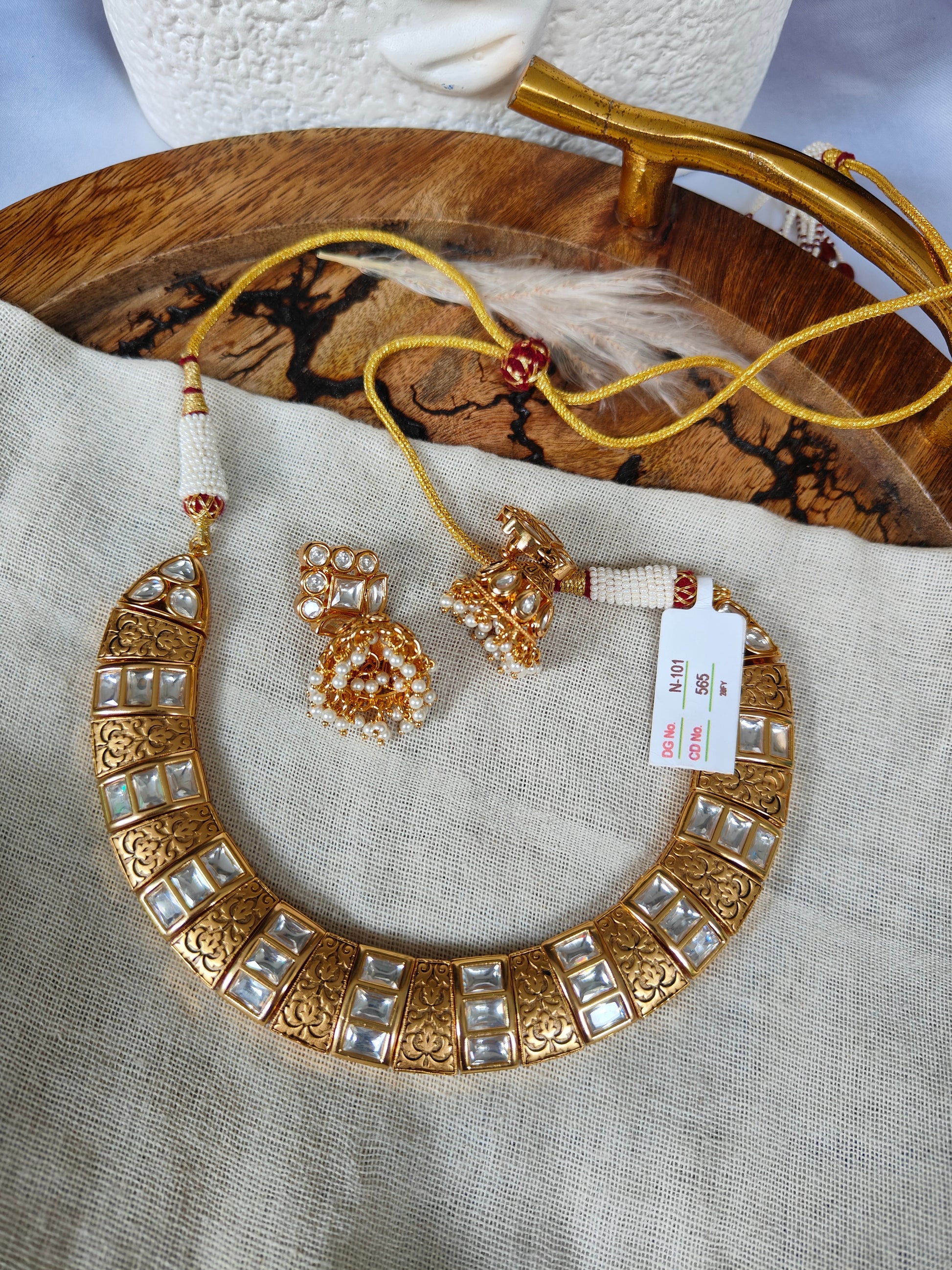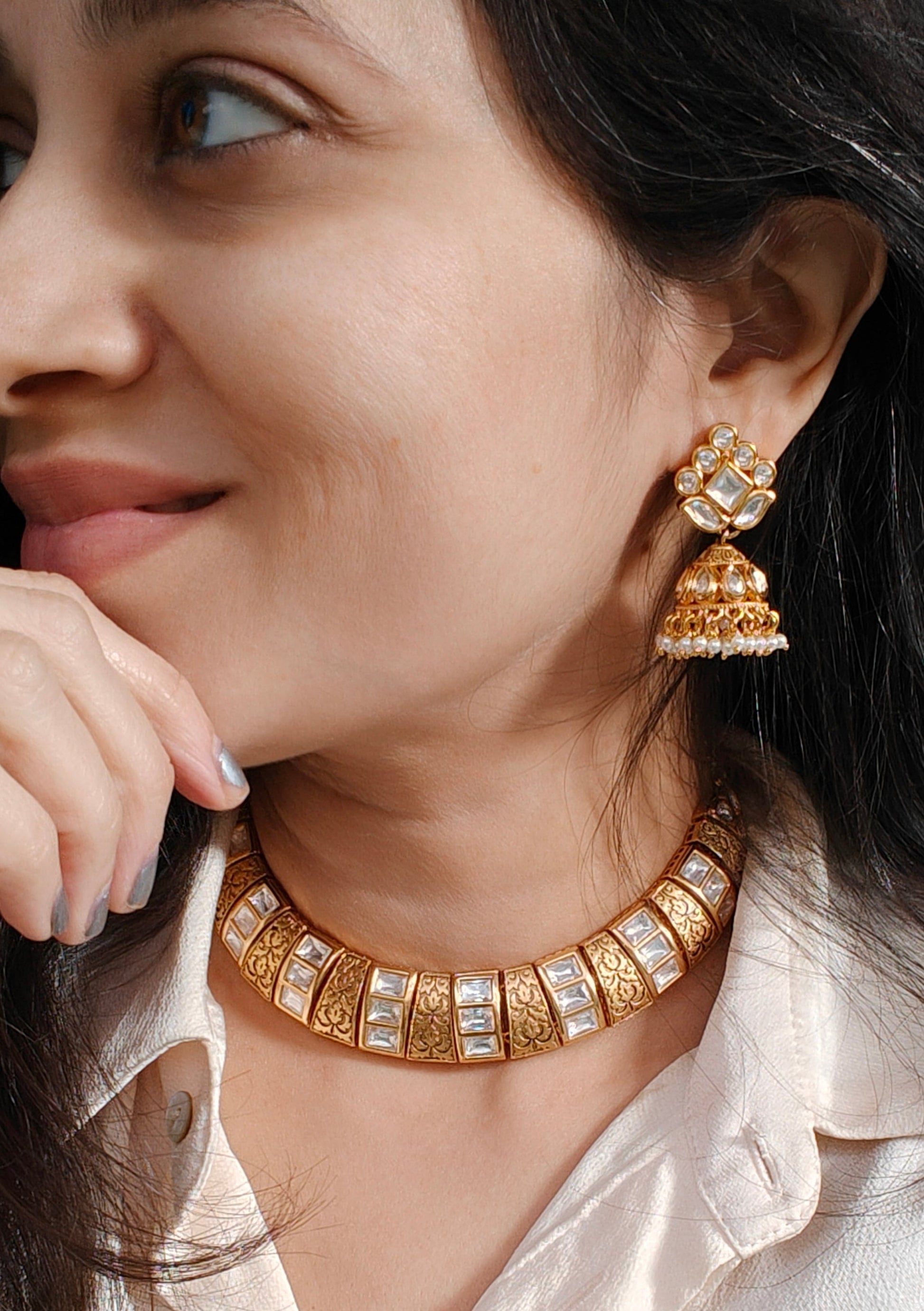 This exquisite necklace set is a celebration of traditional Indian karigari, where every detail tells a story of skill and patience. Handcrafted in a rich antique gold finish, the necklace features meticulously set square Kundan stones, framed by finely hand-engraved floral motifs inspired by age-old royal jewellery.