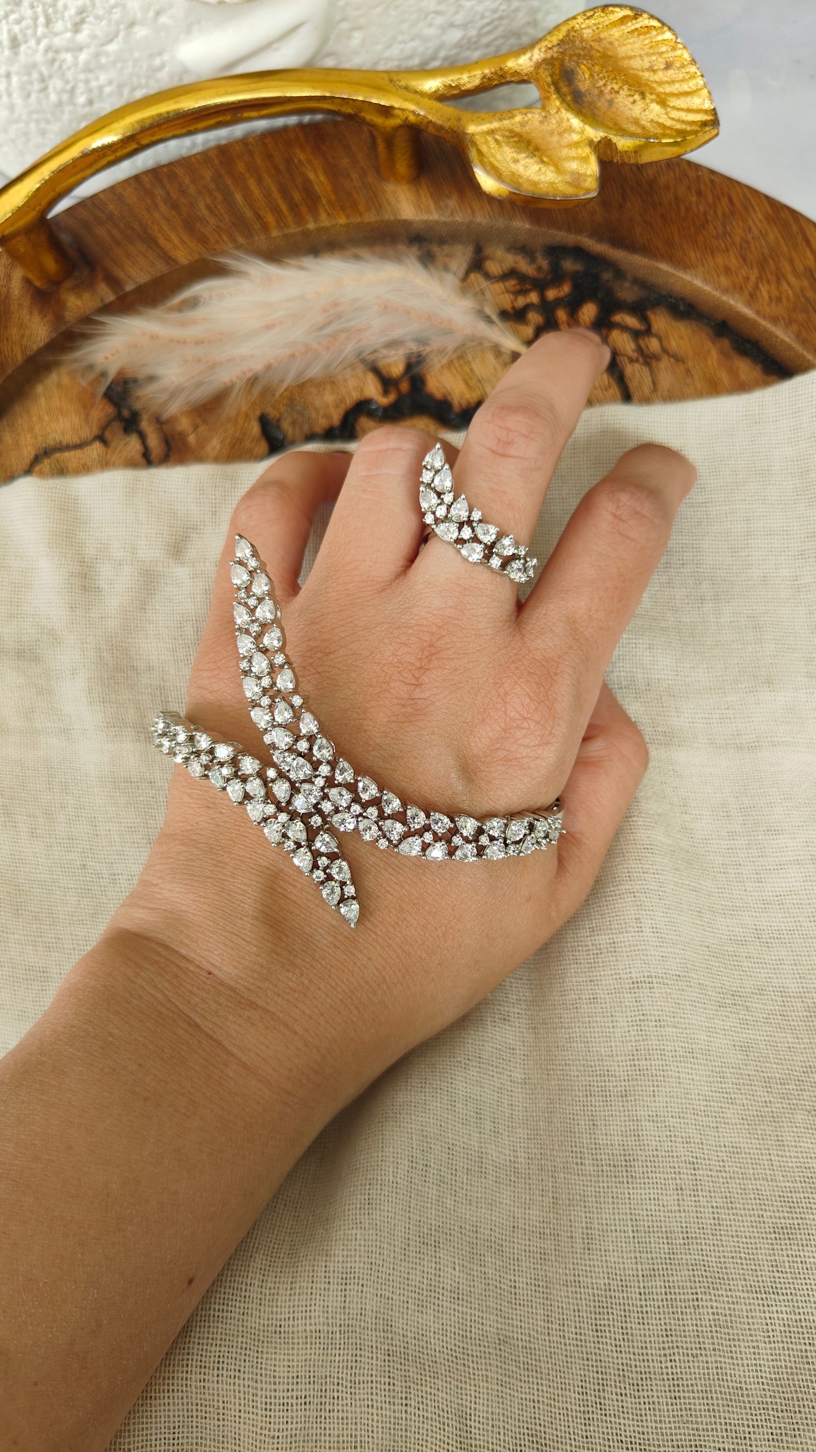 Striking, sculptural, and undeniably glamorous, the Zehra Crystal Palm Harness is designed to make a bold statement. This exquisite hand accessory seamlessly combines a statement ring with a cascading palm cuff, connected through fluid strands of shimmering stones that elegantly trace the contours of your hand.