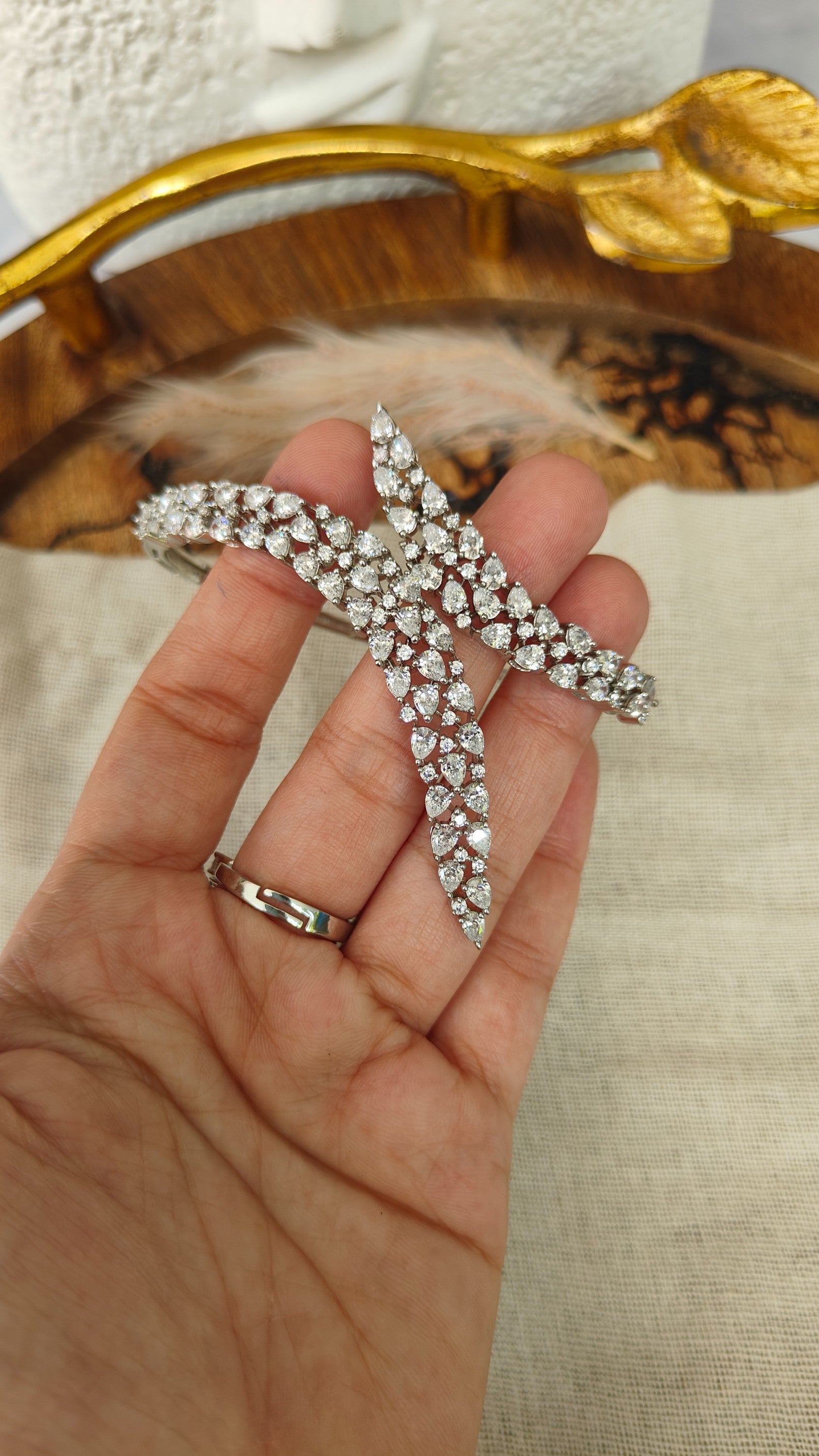 Adorned with brilliant pear-cut and round crystals, the design creates a luminous, layered effect that catches the light beautifully with every movement. The vine-like arrangement adds a touch of grace while maintaining a modern, high-fashion edge.
